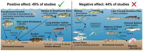 Mercer et al. [63] found that in an Ontario lake following an invasion of D. polymorpha, bluegill (Lepomis macrochirus) and yellow perch (Perca flavescens) did not show any signs of change. Similarly, Fernandez et al. [72] found no change in zooplankton energy available for C. clupeaformis larvae in South Bay, Lake Huron, following invasions of dreissenid mussels. Dreissenid invasions were also not found to have an impact on the recreationally important threadfin shad (Dorosoma petenense) in Lake Mead or the growth of white sucker (Catostomus commersoni) in Oneida and Cayuga lakes [73,74].