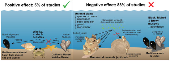 The studies on impacts of mussel invasions on native bivalves were almost all negative, and this was the case in freshwater environments and the limited studies in marine environments. While this component was included in the review for completeness, mussel reef restoration initiatives typically also enhance the amount of habitat available for mussels to attach and focus on native mussel species, and thus, competition for habitat would be between native mussel species [12,13].