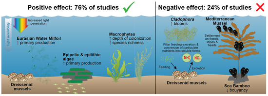 In North America, the maximum depth of light penetration sufficient to support benthic algal photosynthesis in several lakes increased after dreissenid invasion. For example, in Oneida Lake, the depth of light penetration increased from 7.5 m to 10.5 m after the invasion of D. polymorpha. This increased the primary production of epipelic and epilithic algal and Eurasian water milfoil (Myriophyllum spicatum) [88,89,90]. Similarly, in Lake Simcoe, the maximum depth of macrophyte colonization increased from 6.0 to 10.4 m and macrophyte biomass increased from 1.2 to 3.1 kg m−2 [91], and in inner Cook’s Bay, macrophyte coverage increased by 65% [92].