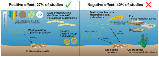 Of the 48 articles reporting effects on phytoplankton communities, 27% reported positive, 40% reported negative, and 6% reported no effect (Figure 1 and Figure 6). Positive effects were generally associated with the reduction in phytoplankton in eutrophic waters, thus returning systems towards their natural state. Negative effects were typically related to the change in the phytoplankton composition through selective grazing, and in some cases leading to an increase in cyanobacteria and the potential production of cyanotoxins. In 27% of cases, there was an effect on the phytoplankton community; however, the direction of the effect was not stipulated (Figure 1 and Figure 6).