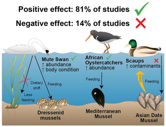 Of the 21 articles reporting effects of invasive mussels on birds, 81% reported positive effects, 14% negative effects and 5% no effect (Figure 1 and Figure 8). Generally, positive effects were associated with increased prey biomass and birds feeding directly on the invasive mussels. Negative effects typically arose from the absorption of toxins that would otherwise be inaccessible when feeding on the invasive mussels (Figure 8).