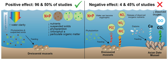 In many freshwater lakes, dreissenid invasions have significantly reduced total concentrations of suspended solids, phosphorous and chlorophyll a, leading to increased water clarity [95,114]. In some cases, this has led to eutrophic lakes becoming oligotrophic [100]. Although particulate matter typically declines, in many cases, through excretion, dissolved nutrients, including ammonium, nitrate and phosphorous, increase [99,115,116,117]. For example, in Neva River Estuary, the invasive D. polymorpha population was estimated to precipitate >15,000 kg of particulate organic matter and release >500 kg of dissolved inorganic phosphorous each day [118].