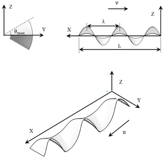 where represents the parameter , denotes the maximum swing angle, signifies the wavelength of the banded fin fluctuation, represents the angular frequency, denotes time, and indicates the initial phase. The boundary conditions for the surface motion of the fin body are as follows: the length of the banded fin, , is 0.9 m, corresponding to in Equation (1). The height of the fin surface ranges from 0.05 m to 0.2 m. The time , and the initial phase .