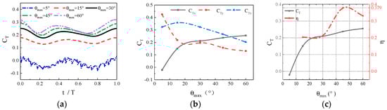 Hydrodynamic characteristic curve: (a) change curve of thrust coefficient at different swing angles; (b) the change curve of force coefficient under different swing angles; (c) hydrodynamic characteristic curves under different swing angles.