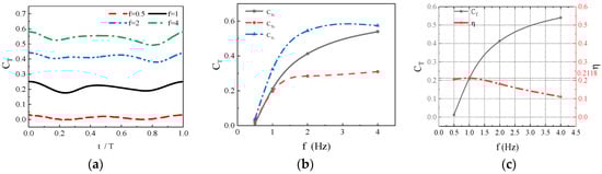 Hydrodynamic characteristic curve: (a) change curve of thrust coefficient in one week under different fluctuation frequencies; (b) force coefficient curves at different frequencies; (c) hydrodynamic characteristic curves at different frequencies.