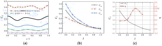 The time–domain curve illustrating the variation in the thrust coefficient with the advance velocity coefficient in a single period of the banded fin is calculated and presented in Figure 7a, where it can be observed that, for a given wavelength-to-fin length ratio () of 1, the trend of thrust coefficient under different advance rate coefficients () follows a similar pattern to other operational conditions, wherein the thrust coefficient undergoes two fluctuations within each cycle and exhibits consistent amplitudes at both peaks and troughs. Generally, an increase in the advance rate coefficient () leads to a decrease in the thrust coefficient; moreover, when equals 1.0, the thrust coefficient becomes negative.