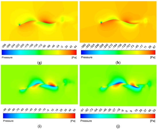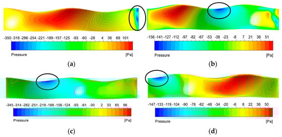 When t/T = 0.5 (Figure 8c), a small localized pressure region forms on the outer side of the leading edge of the oscillating fin, corresponding to the pressure amplitude. The leading surface exhibits negative pressure, with suction acting significantly at the wave crest. The maximum suction pressure reaches 345 Pa, and the pressure amplitude is 96 Pa. According to the thrust coefficient curve, the generated thrust at this time is the second largest among the four time points.