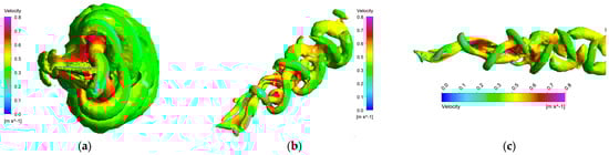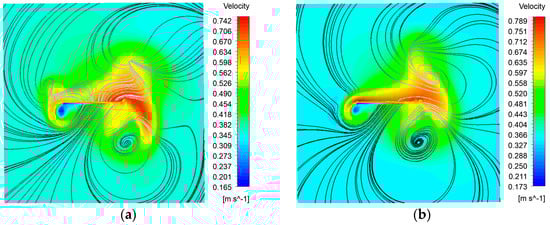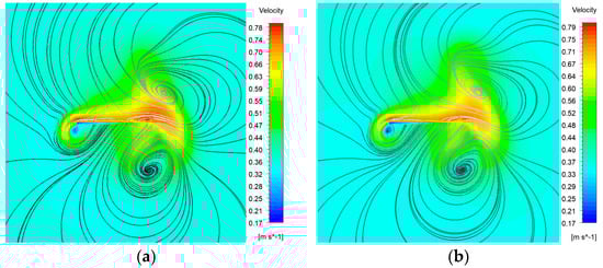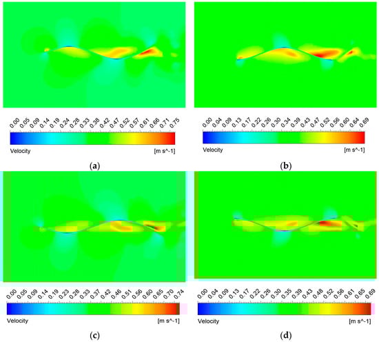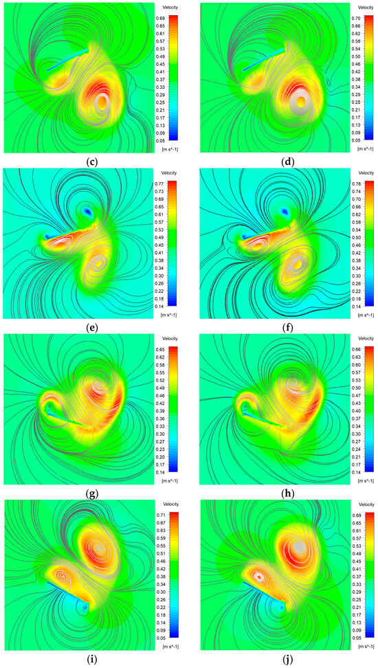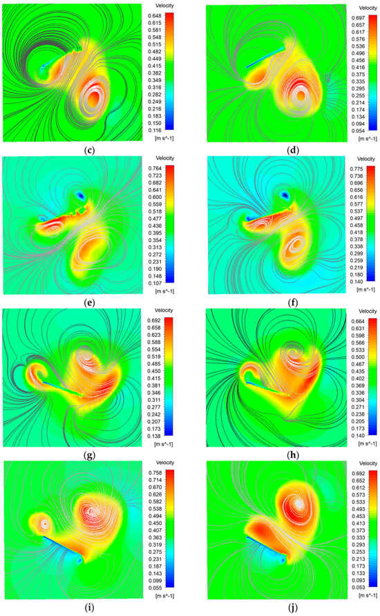 It can be observed that, compared to the non-chamfering condition (left side of Figure 20), the streamline distribution at the end section of the chamfered fin surface is denser and exhibits greater vorticality. Consequently, it exerts a more pronounced acceleration effect on water flow, leading to a wider distribution of peak velocities. Similar to varying the angle of attack, optimizing the shape of the fin surface also induces changes in the flow field. Moreover, chamfering enhances vortex energy utilization, thereby reducing input power requirements and improving wave propulsion efficiency for banded fins.