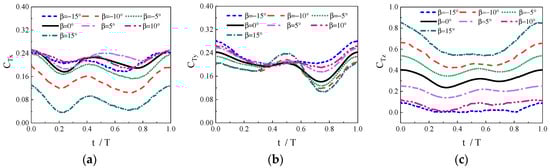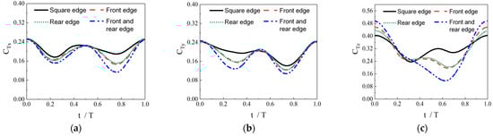 Variation curve of internal force coefficient in one period under different chamfer shapes: (a) x-axis thrust coefficient; (b) y-axis thrust coefficient; (c) z-axis thrust coefficient.