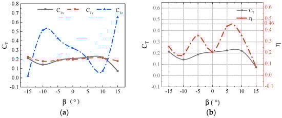 The open water characteristic curve of the banded fin is presented in Figure 7c, revealing that the optimum efficiency point occurs at a propulsion rate coefficient , with a corresponding propulsion efficiency of 45.8%. For , the propulsion efficiency gradually increases as the propulsion rate coefficient rises; however, for , an increase in the propulsion rate coefficient leads to a decrease in propulsion efficiency (as shown in Table 7).