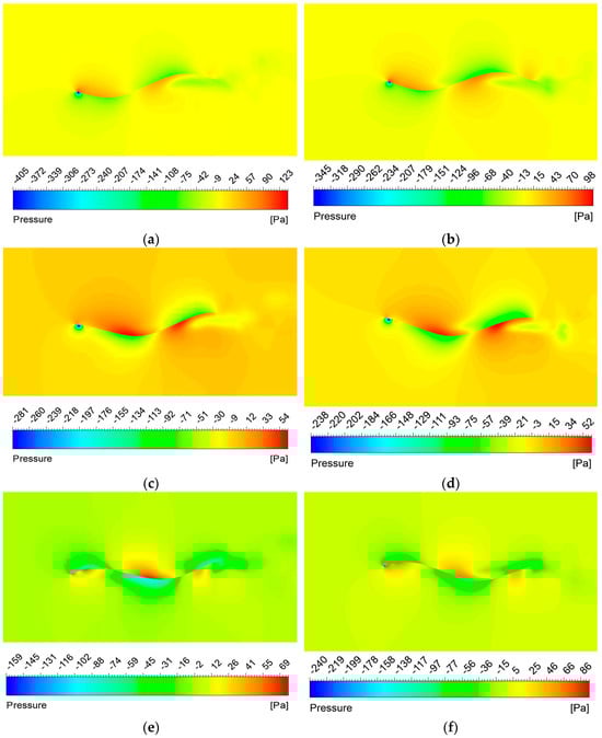 The change curves of the average thrust, lateral force, and lift coefficients under varying advance rate coefficients are shown in Figure 7b. It is evident that as increases, the thrust, lateral force, and lift coefficients gradually decrease, contributing to a smoother reduction in speed. When other oscillation parameters remain constant, an increase in the advance velocity coefficient results in a higher incoming flow velocity while maintaining the same flow area. This increased flow velocity causes a rise in form drag, leading to a significant increase in total resistance and, consequently, a reduction in forward propulsion force. As the flow velocity continues to rise, the growth rate of form drag slows down, resulting in a more gradual decrease in the total thrust coefficient. Overall, the thrust coefficient remains consistently higher than the lateral force coefficient, but it is smaller than the lift coefficient.