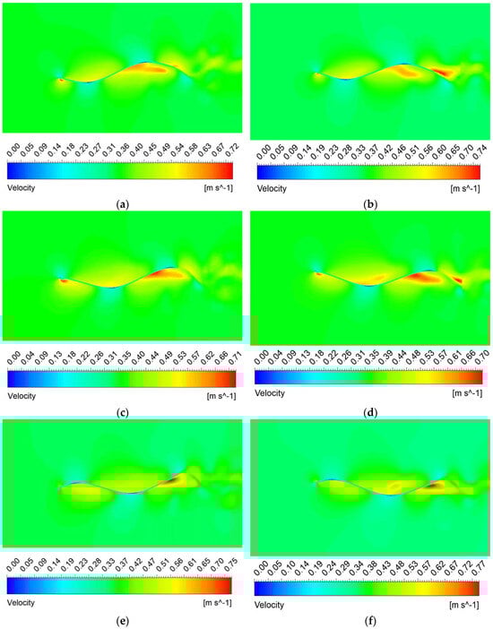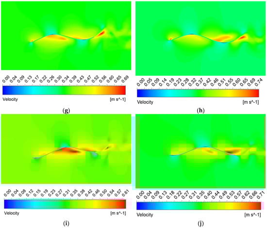 Velocity field cloud images on the fin surface at different time points ( = 0.1 m) were captured during a typical single cycle, as illustrated in Figure 9.