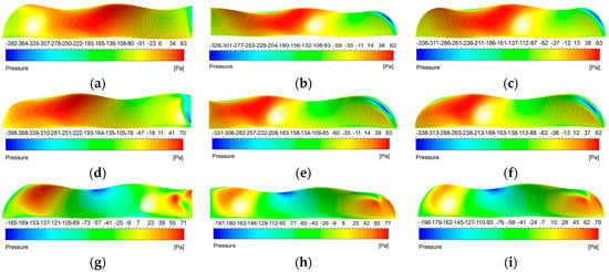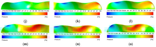 The pressure field cloud map of the fin surface at different time points within a single period is depicted under typical working conditions, as illustrated in Figure 8: