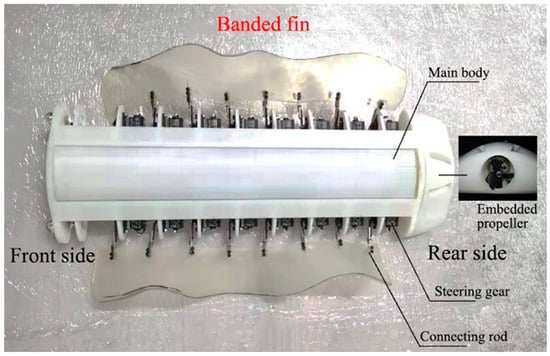 The underwater bio-inspired thruster is equipped with an embedded propeller in its tail, enhancing its risk-avoidance capability. This design generates increased thrust and higher propulsion efficiency compared to an external propeller. Moreover, it reduces the noise generated by the propeller to some extent, thereby improving the vehicle’s stealth performance. Subsequently, the main body of the vehicle, steering gear, damping linkage mechanism, and bio-inspired banded fin are assembled to achieve an overall effect, as depicted in Figure 21:
