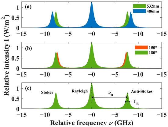 Equations (9)–(11) represent the dual-wavelength, dual-angle, and dual-parameter models, respectively, that is, models based on the two Brillouin frequency shifts at two different wavelengths or two scattering angles, or the frequency shift and linewidth at a fixed wavelength and scattering angle. Two wavelengths of 532 nm and 486 nm and two backscattering angles of 180° and 150° were selected for ocean lidar detection. The spectral distributions of the three models in seawater are presented in Figure 1, where the Brillouin spectra are simulated under controlled conditions of water temperature (20 °C) and salinity (33‰).