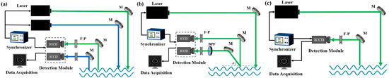 Schematics of three inversion methods: (a) dual-wavelength, (b) dual-angle, and (c) dual-parameter models. M: mirror; F-P: Fabry–Perot etalon; BPF: bandpass filter.