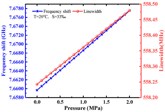 The relationship between pressure and Brillouin characteristics can be established by bringing Equations (4)–(8) into Equations (1) and (2). Figure 3 shows the changes in frequency shift and linewidth of Brillouin scattering with the change in pressure at the same temperature and salinity. Based on the ability of ocean lidar to detect the upper ocean, we simulated the pressure distribution ranging from 0 to 2 MPa, corresponding to seawater depths of 0 to 200 m. The Brillouin frequency shift and linewidth exhibit a linear and positive correlation with pressure, with the frequency shift changing by approximately 18 MHz and the linewidth by 0.2 MHz. Consequently, the influence of pressure on the inversion model cannot be ignored, particularly in the case of the Brillouin frequency shift.