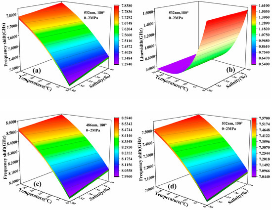 Three-dimensional distributions of frequency shift and linewidth versus temperature, salinity, and pressure: (a) frequency shift at 532 nm, 180°; (b) linewidth at 532 nm, 180°; (c) frequency shift at 486 nm, 180°; (d) frequency shift at 532 nm, 150°.