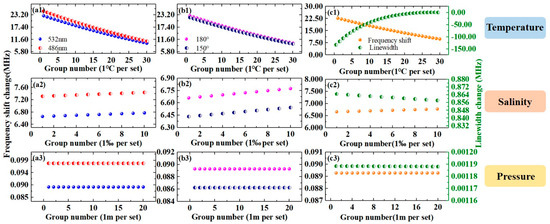 Differences in frequency shift and linewidth vary with the changes in temperature, salinity, and pressure: (a1–a3) dual-wavelength model, (b1–b3) dual-angle model, and (c1–c3) dual-parameter model.