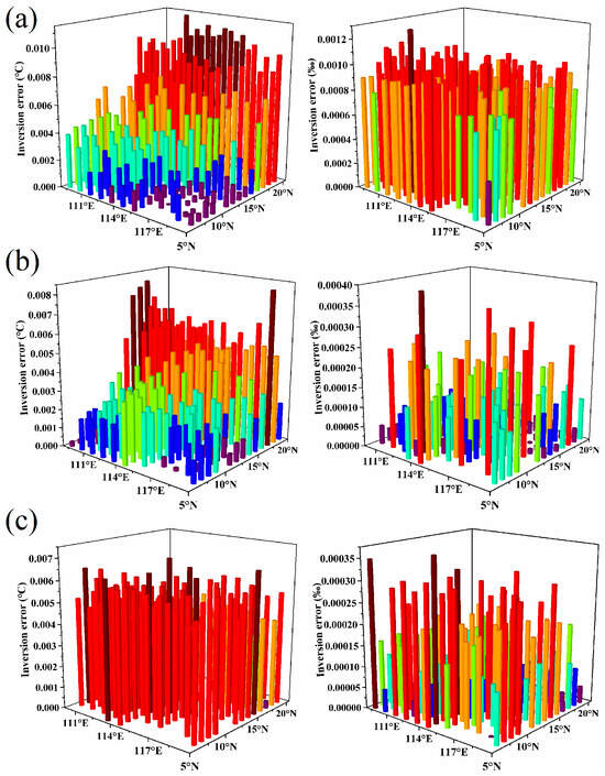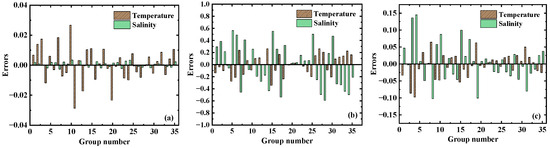 Inversion errors of temperature and salinity at different depths: (a) 0 m, (b) 100 m, and (c) 200 m.