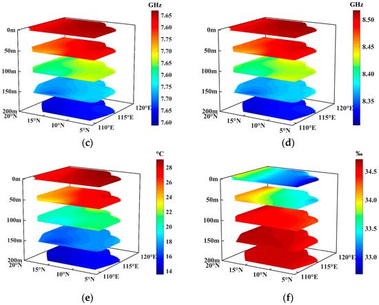 Inversion results of temperature and salinity via the dual-wavelength model in the South China Sea at 0–200 m depth. (a,b) Actual temperature and salinity, (c,d) frequency shift at 532 nm and 486 nm, and (e,f) inversion of temperature and salinity.