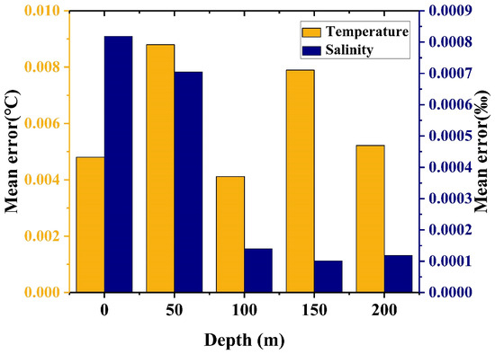 Average inversion error of temperature and salinity in different depths of the South China Sea.