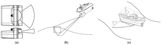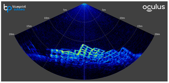 The multibeam sonar equipment used in this study is the Oculus M-Series. This device collects echoes from a single pulse through a set of receivers and converts the sonar intensity data into images for easier observation through mathematical transformations. The Oculus sonar system can detect multiple targets simultaneously. When the sound pulses reflect off various targets, they return to the receiver at different times. The receiver captures all these echo signals, corresponding to a time span that is approximately twice the maximum working range. Therefore, the sonar system’s acoustic “illumination” range for targets composed of concrete is limited, meaning that it can only display targets within the sonar beam (as shown in Figure 1a), while targets outside the beam will not appear on the sonar display. We installed the Oculus sonar device at the bottom of a remotely operated vehicle (ROV) or fishing vessel, with an inclination angle of 45°, and scanned the 3 × 3 × 3 cube structure, as shown in Figure 1b,c. When the artificial reef area is too deep for the imaging sonar to detect, an unmanned boat can be used to dive to the seabed for scanning. As the boat moves forward, the sonar device can scan underwater images [18].