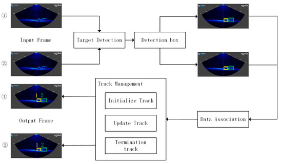 The MOT algorithm usually includes the following stages. First, target detection algorithms detect targets in each frame of the image; second, detection boxes are generated, and the features of each target, such as appearance features and motion features, are extracted; next is data association, where the detection results of the current frame are associated with the trajectories of the previous frame; finally, trajectory management is performed, which involves initializing new target trajectories, updating existing trajectories, and terminating the trajectories of lost targets. Due to the consistent appearance characteristics of ARS in sonar images and the absence of overlapping phenomena, including the image features of sequentially appearing and potentially overlapping artificial reef (AR) targets as influencing factors for target tracking would make it difficult to distinguish between consecutively appearing AR targets at the same location. The MOT algorithm used in this study does not take the appearance features of detected targets as reference factors but instead focuses on position features for target tracking.