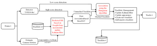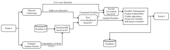 BOTSORT [27] is one of the most widely used algorithms in target tracking tasks. Its structure is shown in Figure 5. This algorithm employs a Kalman filter and introduces a camera motion compensation mechanism. In the BOTSORT algorithm, the Kalman filter is used to predict the target’s position in the next frame, while the camera motion compensation allows for more precise target position prediction, especially when the camera is moving. Additionally, BOTSORT uses trajectory prediction techniques to maintain target tracking even when the target is not detected in certain frames.