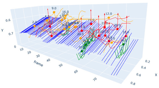 Figure 4b shows the trajectory results of MOT based on the MOT algorithm, using the YOLOv8n pose model by Song et al. [18,26] to identify targets frame by frame from the original data. The blue straight line represents the seabed, while the red and orange broken lines indicate the identified paths of ARS. The red color signifies the recognized complete reef tracking path, yellow represents the identified incomplete reef tracking path, and green indicates the identified sedimentation location tracking path and shape.