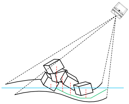The position of the AR in a single identified frame image is shown in Figure 8, where the blue lines represent the seabed identified by the model, the green lines represent the identified silted parts, and the red lines represent the distance from the AR to the seabed mud surface. If the silted part is identified, it is taken as the seabed mud surface; if not, the seabed is taken as the seabed mud surface. The estimation method for the void of a single AR is