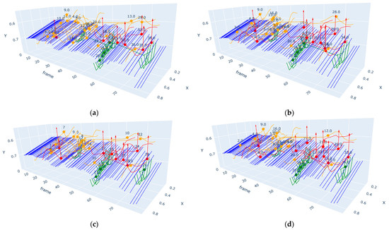 From Table 3, it can be seen that the improved MOT algorithm achieved better results across various YOLOv8n-pose models. Specifically, for the YOLOv8n-pose model, both the HOTA and MOTA metrics showed notable improvements, with the HOTA increasing by 0.433 and the MOTA increasing by 0.069. On the YOLOv8n-poseRFSA and YOLOv8n-poseMSA models, our model achieved significant improvements in the MOTA and HOTA indicators, respectively, although there were slight reductions in the corresponding HOTA and MOTA indicators. Our improved MOT algorithm also showed good results in the IDFN, IDFP, and IDSW indicators. We plotted the tracking paths of different MOT algorithms based on the YOLOv8n-pose model, as shown in Figure 10.