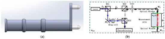 The principle is shown in Figure 1b. The frequency of the laser emitted from the laser source is . The laser beam is split into two beams, the transmitted and reflected beams, by the beam splitter BS1. The reflected beam, serving as the reference beam, is reflected by mirror M1 and then passes through the Bragg cell, generating a frequency shift of . The beam is then reflected by the beam splitter BS3 onto the surface of the photodetector. The transmitted beam acts as the measurement beam, passing through the beam splitter BS2, being collimated by a lens system, and directed by mirror M2 so that it vertically enters the measurement area. After passing through the optical windows in front and behind the measurement area, the beam reaches the bottom reflective surface M3. Then, the beam is reflected by M3, and the reflected beam travels back through the measurement area, mirror M2, beam splitter BS2, and beam splitter BS3 to reach the photodetector, where it interferes with the reference beam. As shown in the diagram, the blue path represents the path of the reference light traveling through air, with a length of , the black path represents the path of the measurement light traveling through air, with a length of , and the red path represents the path of the measurement light traveling through the measurement area. D is the constant length of the measurement area. is the refractive index of air, and is the refractive index of the seawater to be measured in the measurement area. The intermediate frequency signal obtained by the detector is as follows: