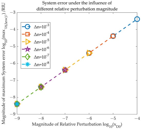 Based on the analysis in Table 3, the plot in Figure 2 is generated. Figure 2 illustrates the variation in systematic errors with a relative perturbation amplitude magnitude () under different refractive index variation magnitudes. The different symbols represent different refractive index variation magnitudes. From Figure 2, it can be seen that for the same refractive index variation magnitude, the larger the relative perturbation amplitude, the greater the systematic error in the refractive index variation measurement, and this error exhibits a linear increase on a logarithmic scale.