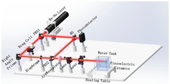 Using Equation (17), a refractive index measurement precision of RIU can be achieved. Based on this equation, the refractive index variation over time was achieved by heating deionized water using a heating stage. A vibration source (piezoelectric ceramics) was placed on the reflective surface in the measurement area to induce harmonic oscillations of the measurement area’s geometric length, simulating the introduction of optical path length perturbations, and is set to 0.16 m. The experimental setup is shown in Figure 3.