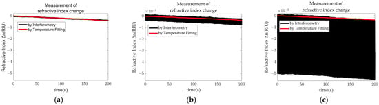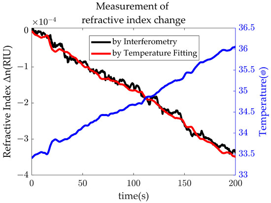 In the experiment, a temperature sensor (Mobo Robotics, mSTS-P, with a measurement precision of 0.001 °C) was used for real-time temperature monitoring. Before the experiment, the temperature was used to calibrate the precision of the refractive index measurement by the interferometric method through fitting. As shown in Figure 4, the blue curve represents the temperature variation measured by the temperature sensor, the red curve represents the refractive index variation in deionized water obtained through fitting using Equation (17), and the black curve represents the refractive index variation measured by the interferometric system.