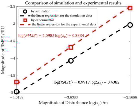 From Figure 6, it can be seen that the data under experimental conditions show a roughly linear relationship with the simulation data on a logarithmic scale with a similar trend. Both exhibit an increase in RMSE as the relative perturbation amplitude increases. Additionally, fitting the scatter plot, the slope indicates that the two sets of data have a similar linear relationship. However, the slope of the experimental data (1.0985) is slightly greater than that of the simulation data (0.9917), suggesting that the error growth in the experiment is slightly faster than in the simulation setup. The intercept of the data fitting under experimental conditions is 3334, while the intercept under simulation conditions is −0.4382. The difference in intercepts indicates that, in the absence of relative perturbations, the error baseline in the experimental data is higher, which suggests that the experimental process may be affected by environmental noise and other factors.