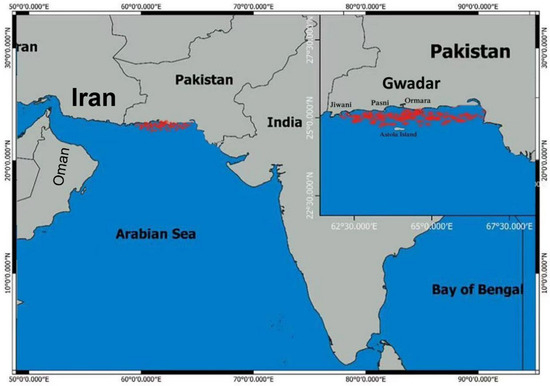 The Balochistan coastal region is situated in the northern part of the Arabian Sea bordering Iran. Gwadar is a stunning harbor city on the western coast of Pakistan, holding significant importance for the province of Balochistan and situated around 635 km along the Makran coastal highway. This city has immense importance for the province of Balochistan [50]. The Makran coast is endowed with a number of breathtaking beaches, including Gwadar, Ormara, Pasni, and Somiani. The research region comprises Gwadar and the nearby landing sites of Ormara, Pasni, and Jiwani as its principal towns and fishing ports. The economic hub of the coast of Balochistan is the Gwadar deep-water harbor. (Figure 1).