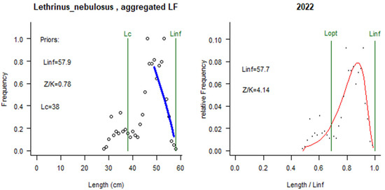 The length-based Bayesian (LBB) approach employs Bayesian Markov Chain Monte Carlo (MCMC) methods to analyze data from commercial fish and invertebrate populations [40]. The calculated F/M ratio of 2 further corroborates the overfished condition, while the F/k and Z/k ratios are 2.8 and 4.14, respectively. This discrepancy underscores the increasing prevalence of overfishing and suggests that targeting larger fish would be beneficial. Furthermore, implementing measures to reduce fishing pressure and increasing gear mesh sizes may enhance the recovery potential of the Spangled Emperor L. nebulosus population along the coast of Balochistan (Figure 5).