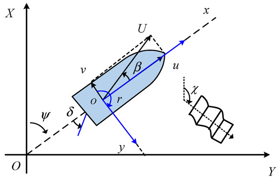 To study the mathematical model of ship motion, it is essential to establish a coordinate system. Two right-handed rectangular coordinate systems are considered, as illustrated in Figure 1. In the presence of waves in a complex ocean environment, denoted by χ as the wave angle, The O-XYZ is the global coordinate system. Point O is usually chosen as the position of the ship’s center of gravity at the initial moment. In this system, the OX axis points due north, OY points due east, and OZ points toward the center of the earth. The o-xyz is the body-fixed coordinate system, with o as the midpoint of the line connecting the ship’s bow and stern. In this system, ox points to the bow along the ship’s centerline, and oy points to the port side. The heading angle ψ is referenced from the north direction, the rudder angle δ is positive for the right rudder, and r is positive in the clockwise direction. In many ship motions and control scenarios, heaving, pitching, and rolling motions are often negligible, simplifying the problem to a plane motion with only 3 degrees of freedom.