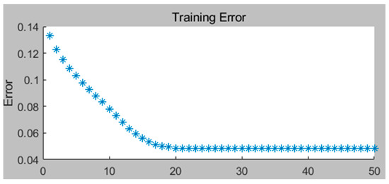 The training data [Y1, Y2, Y3] were added to the MATLAB working area. When the training period was set to 50 times, the convergence state was finally presented, and the training error was about 0.04°, as shown in Figure 4, indicating that the accuracy of the training process was satisfactory.