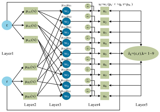 Layer4: The output language layer represents the language value of the controller’s output language variable. The front end of the output language layer is the normalized result of all rule strengths and then calculates the output of each rule ui. Each neural network node corresponds to a specific membership function, which is responsible for delineating the fuzzy boundaries of the language value. It is worth noting that the membership function used adopts the Sugeno model, which is a first-order linear function. This is because of the efficient performance of the Sugeno model. In model construction, if the preconditions are fuzzy, the subsequent results will be clear quantities to ensure the output results’ accuracy and reliability.