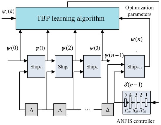In Figure 6, Δ represents the time shift factor, denotes the heading command, the desired trajectory is formed based on the set heading , and all is stored to create the actual motion trajectory. The expression of the closed-loop control performance index is an optimization function, as shown in Equation (23). The consequent parameters {pAk, qBk, p0k} of the Sugeno-type fuzzy rule in ANFIS are determined through the learning law provided by the BP algorithm, as shown in Equation (24).