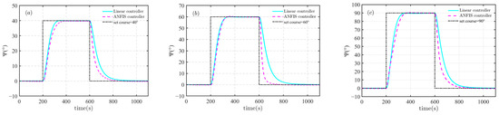 The effect of linear controller and ANFIS controller on ship heading control: (a) set course = 40°; (b) set course = 60°; (c) set course = 90°.