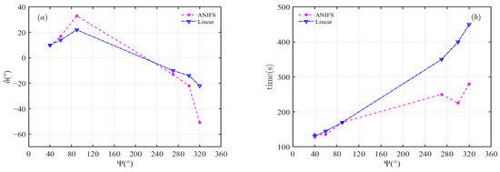 According to Figure 13 and Table 7, it can be seen that under bad sea conditions, when the expected heading is 40° and λψ = 100, the response time of the linear controller and ANFIS controller is 100 s and 180 s, respectively, and the response time is reduced by about 33.3%. The Aψ is 5.24° and 5.85°, and the Iδ is 1.84° and 1.54°, respectively. When the left rudder operation is performed, Aψ is 7.05° and 6.96°, and Iδ is 1.96° and 1.71°, respectively. The results show that the response time of ANFIS is longer than that of the linear controller, but its Iδ index is smaller. The course stability of the two controllers is basically the same regardless of whether the rudder is turned right or left. It can be concluded that the response time of ANFIS is affected in bad sea conditions, but the stability of ANFIS is better than that of the linear controller during the whole course-keeping phase, and it has better energy-saving characteristics.