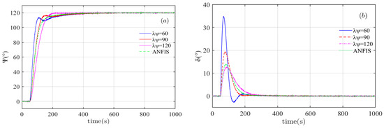 Figure 15 and Table 8 show large course control and rudder angle performance (ψ = 120°). Figure 15a and Table 8 show that the Aψ using the λψ = 60, λψ = 90, and λψ= 120 controllers are 5.51°, 7.01°, and 8.52°, respectively. They increased by 27.22 percent and 21.54 percent, respectively. The Aψ of the ANFIS controller is 6.28°, which is second only to the λψ = 60 controller and 13.97% higher. It has satisfactory stability and security. As shown in Figure 15b and Table 8, the Iδ of the linear controller decreases as λψ increases. Notably, the Iδ of the ANIFS controller is measured at 1.46°, which is lower than the minimum value of λψ = 120 for the linear controller. This indicates a superior energy-saving effect achieved by the ANIFS controller.