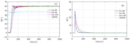Figure 14 and Table 8 show small amplitude course control and rudder angle performance (ψ = 60°). It is worth mentioning that course performance is determined by 100–400 s of course change and 400–1000 s of course hold, respectively. As shown in Figure 14a and Table 8, the Aψ using the λψ = 60, λψ = 90, and λψ = 120 controllers are 2.57°, 3.19°, and 4.14°, respectively, increasing by 24.12% and 29.78%. The controller (λψ = 60) has the fastest response time but has a slight overshoot. The controller (λψ = 120) has the longest response time. The Aψ of the ANFIS controller is 2.86°, which is only 11.28% higher than that of the linear controller with the best directional stability (λψ = 60), has satisfactory stability and safety, and does not produce an overshoot phenomenon. Figure 14b and Table 8 show that the controller (λψ = 60) has a larger control input (maximum rudder angle) than the other controllers, but its Iδ of 0.79° is the smallest among the three linear controllers with different parameters, due to its fast response speed. The Iδ of the ANFIS controller is 1.12°, which not only has a good energy-saving effect but also has no overshoot.