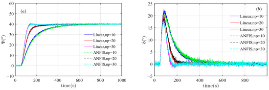 Figure 16a shows that when the controller performance parameter λψ (λψ = 100) and environmental disturbance remain unchanged, the increase in propeller speed will accelerate the system response, but there will be slight overshooting. Figure 16b shows that the maximum rudder angle remains basically constant at different speeds, while the system oscillation increases slightly with increasing speed. Table 9 lists the Aψ and Iδ values of the linear controller and ANFIS controller at different propeller speeds. For the linear controller, when the propeller speed is nP = 10 rps, nP = 20 rps, and nP = 30 rps, the Aψ value is 5.24°, 2.79° and 1.99°, respectively, with a decrease of about 62.02%. For ANFIS controllers, the Aψ values at these speeds are 5.31°, 2.92°, and 1.98°, respectively, representing a reduction of about 62.71%. The results show that the performance of both controllers is improved with the increase in propeller speed. Linear controller in nP = 10 rps, nP = 20 rps, and nP = 30 rps when I in the delta value is 3.04°, 1.71°, and 1.31°, respectively. Similarly, at these speeds, the Iδ values of the ANFIS controller are 3.03°, 1.71°, and 1.30°, respectively. The results show that the two controllers can achieve a comparable energy-saving effect, and the best energy efficiency is observed at nP = 30 rps.