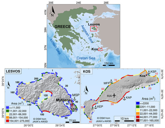 The islands of Lesvos and Kos (Figure 1) are large islands of the northern and southern Aegean archipelago, respectively. Lesvos has an area of 1630 km2, a population of about 83,755 and a coastline length of 320 km, whereas Kos has an area of about 295 km2, a population of 37,100 and a coastline length of 112 km [43]. The two islands show different development models, with the island of Lesvos being much less dependent on tourism than Kos: in 2023, about 53.4 thousand international air passengers arrived at Lesvos and 1.3 million passengers at the island of Kos. Concerning the touristic infrastructure, Lesvos has 7150 hotel beds and low tourism density and intensity (about 347.3 tourist nights/km2 and 17,336 tourist nights/1000 inhabitants, respectively); by comparison, there are 57,200 hotel beds in Kos, with tourism density and intensity being very high (28,917 tourist nights/km2 and 230,000 tourist nights/1000 inhabitants, respectively [44,45]). There were also 4463 day-tourist arrivals in Lesvos and 6925 in Kos in 2023 via cruise ship calls.