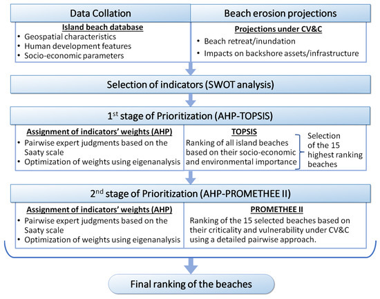 In order to define the weights (or relative importance) of the indicators, the Analytical Hierarchy Process AHP method [76] was used, i.e., pairwise comparisons (using a 1 to 9 scale) in relation to the objective of the analysis and the alternative decisions. Comparisons were based on (32) stakeholders’ and experts’ judgments through interviews during workshops that were held within the MARICC project, and the results were compiled into matrices [77], the consistency of which was evaluated using eigenanalysis. Results are considered consistent when their consistency ratio—C.R. is less than 0.1, whereas, for C.R. > 0.1, the initial judgments on the criteria significance can be adjusted to improve consistency [76]; consistency testing is a key stage of AHP, which makes it one of the most used methods. Then, the framework for ranking the islands’ beaches in terms of their need for management responses (prioritization) was applied in 2 stages (Figure 2).